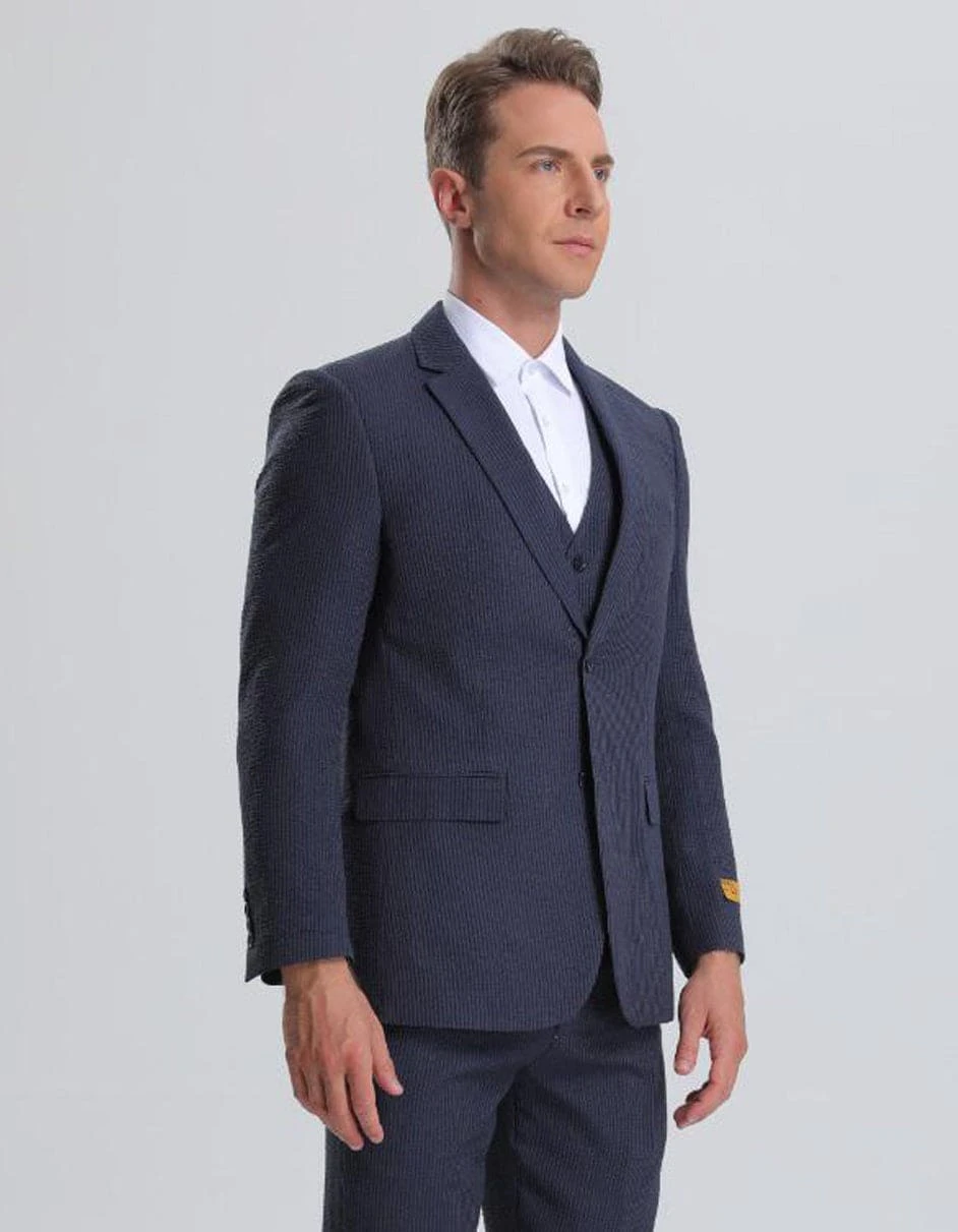 Be the first to review “3 Piece Suit – Navy Blue Three Piece Suit – Mens Vested Summer Seersucker Suit In Navy On Navy Pinstripe” Cancel reply