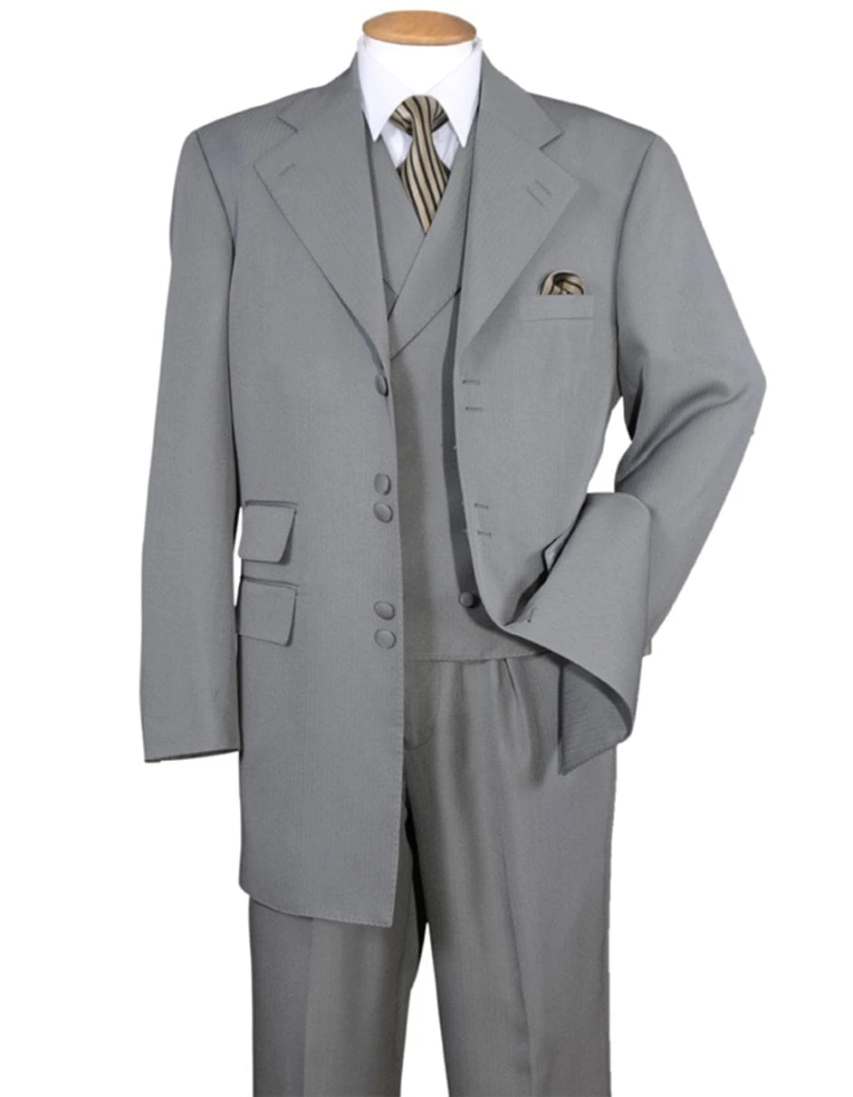 This ain’t no skinny suit. It’s a 6 summary closure, wide notch lapel suit. It features a full length zoot suit style jacket, a faint ton on ton shadow stripe material, a ticket pocket, and a matching double breasted vest. The pants are pleated and come in semi-wide leg. The pants come with a six inch drop. That means if you subtract six inches from your jacket size you will determine your pant size. This means if you order a coat size of 42R the pants will be a 36. All pants are tailor adjustable, and can be let out 2 inches or taken in up to 4 inches. So those aforementioned 36W pants can adjust from 32-38.The pants also come unfinished at the bottom, so you can have them hemmed to the perfect length by a tailor or dry cleaner once you receive them.