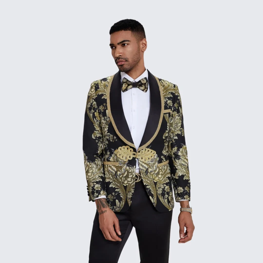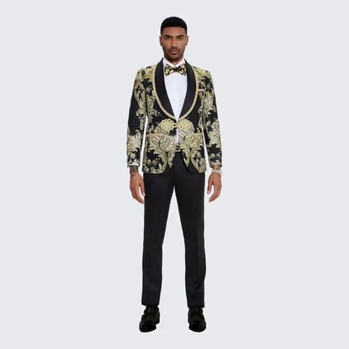 - Men’s Black Tuxedo With Gold Textured Paisley Design – Wedding – Prom