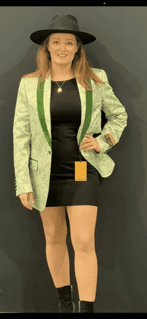 - This blazer features gold on Emerald green sequins in a linear line pattern . Full satin black shawl lapel, black satin trim on pockets. Modern fit. Side Vented. Perfect tuxedo jacket for prom.