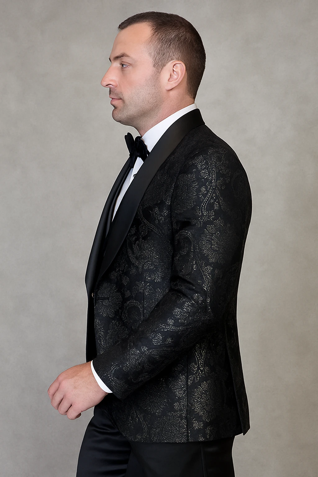 Turn heads at any formal event with this stylish black vested tuxedo, designed for prom, weddings, and special occasions. Featuring a one-summary closure, elegant Japanese paisley lace print fabric, satin shawl lapel, and a matching double-breasted vest. The set includes coordinating satin pants and a matching bowtie for a complete, polished look.