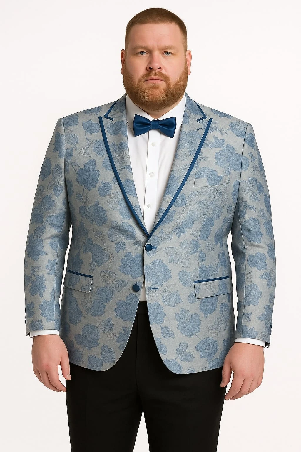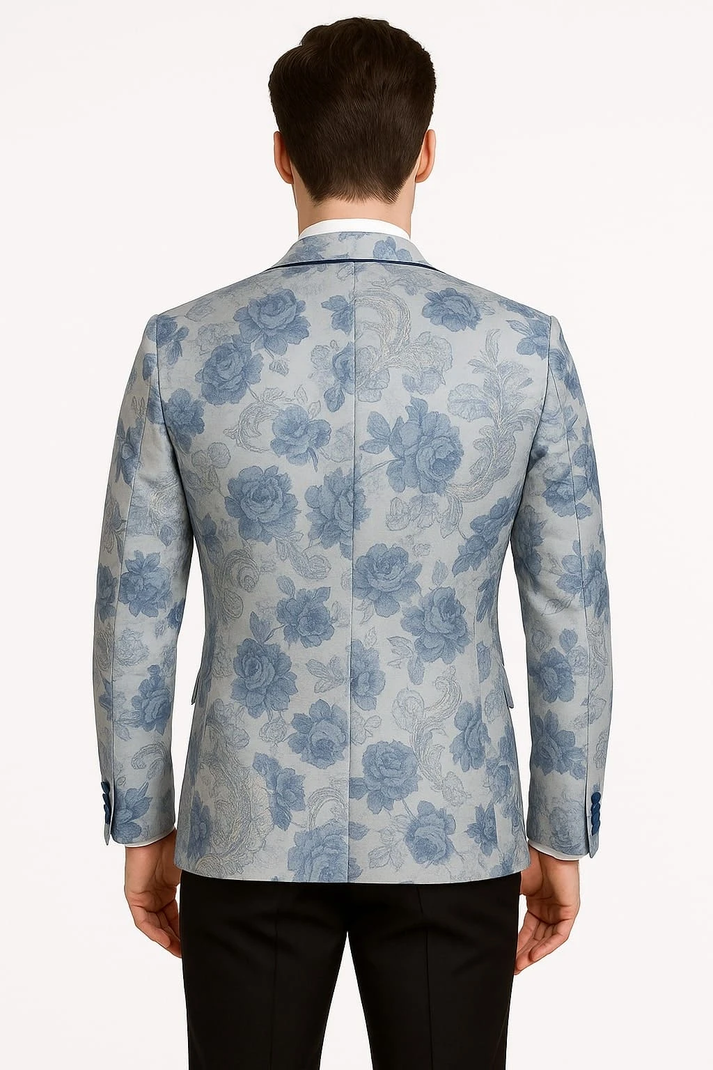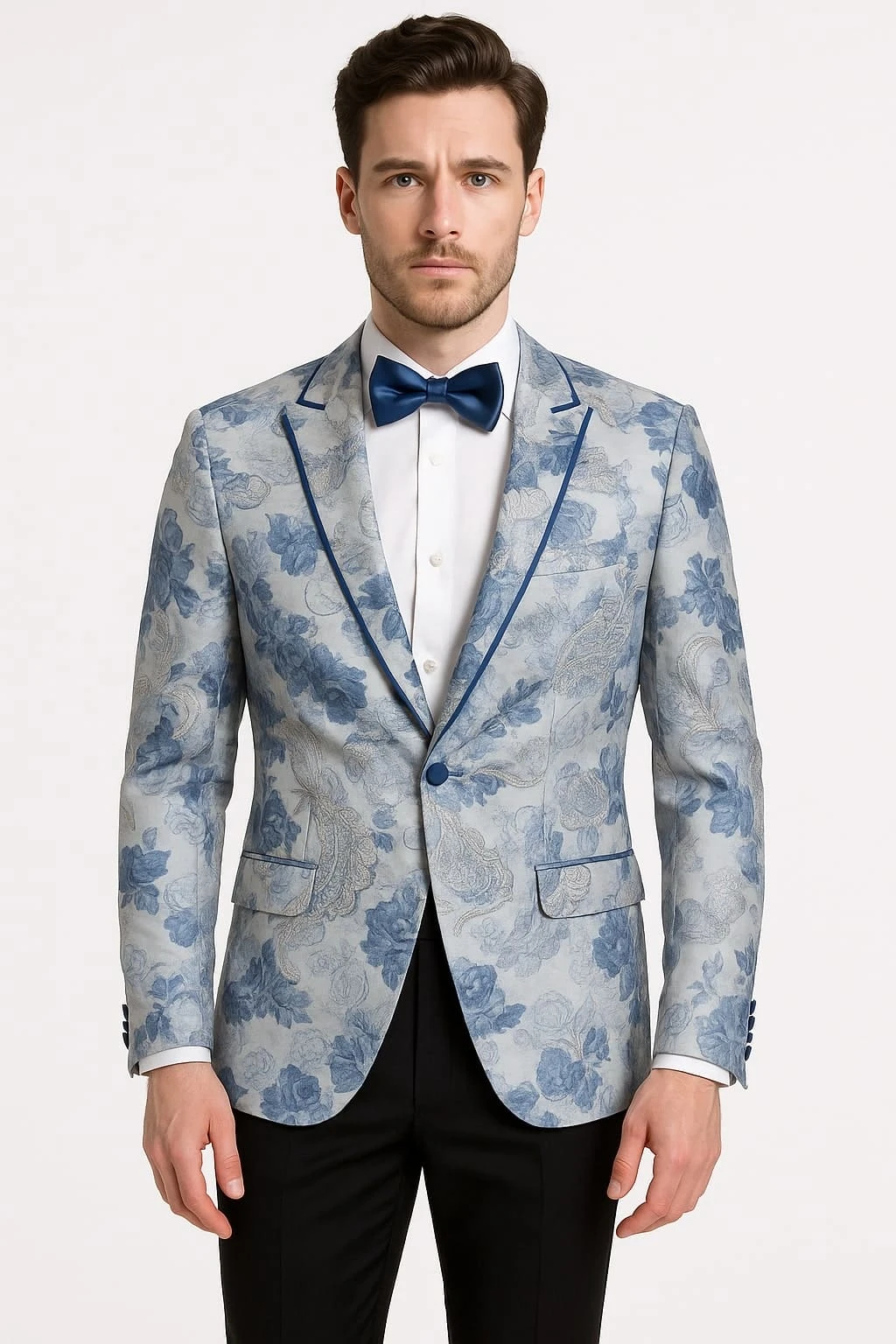 Elevate your formal style with this Men’s Sky Blue Paisley Embroidered Tuxedo Jacket, an eye-catching blend of elegance and statement fashion. Featuring a shimmering sky blue base adorned with intricate paisley patterns in blue, silver, and gold thread, this tuxedo jacket is the perfect centerpiece for weddings, prom, and upscale events.
