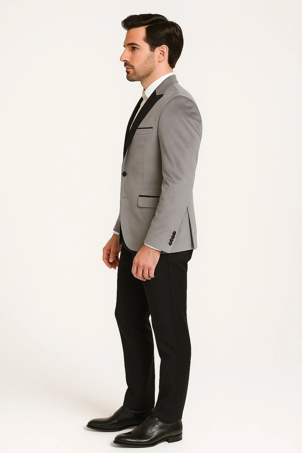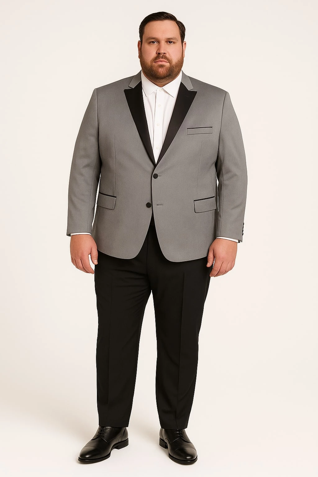 - Classic black satin shawl lapel for a formal look