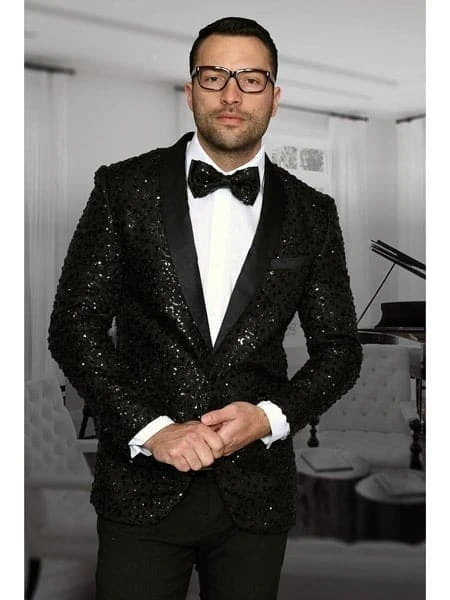 Be the first to review “Men’s Sharkskin Flashy Stage Shiny Sequin Paisley Blazer Dinner Jacket 1 Button Black Sport Coat Jacket” Cancel reply