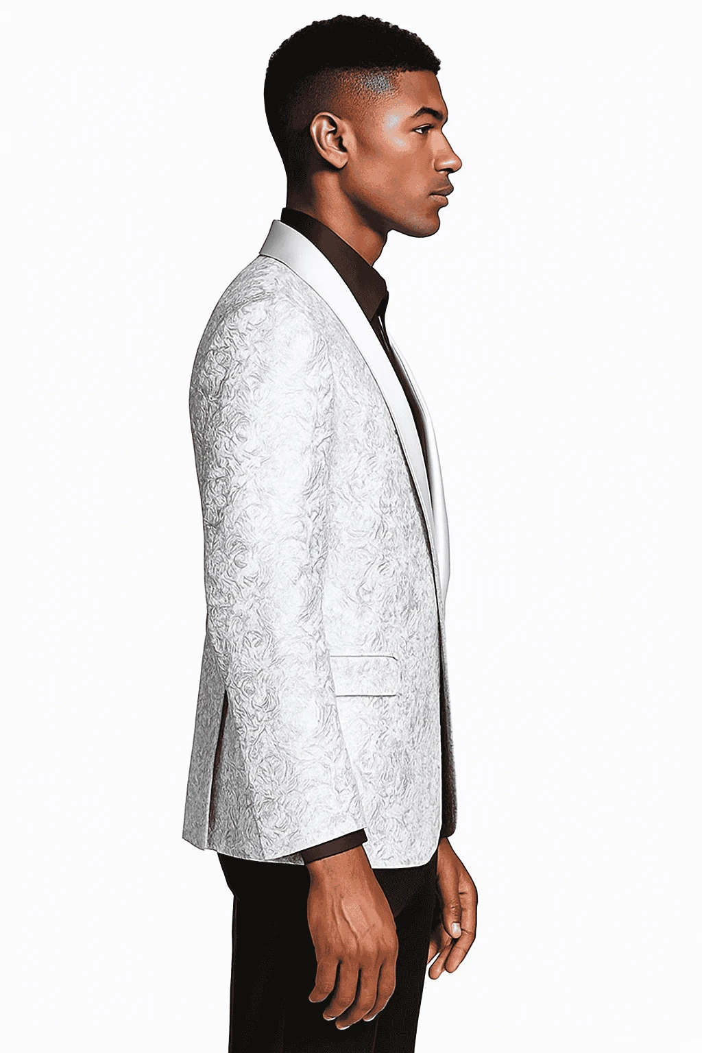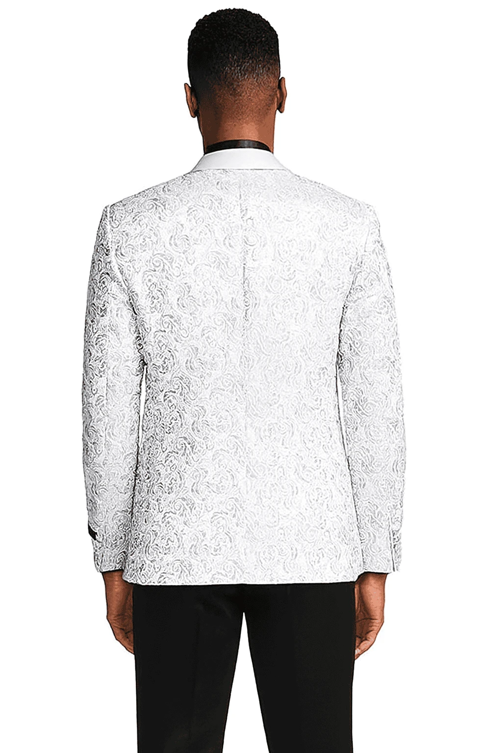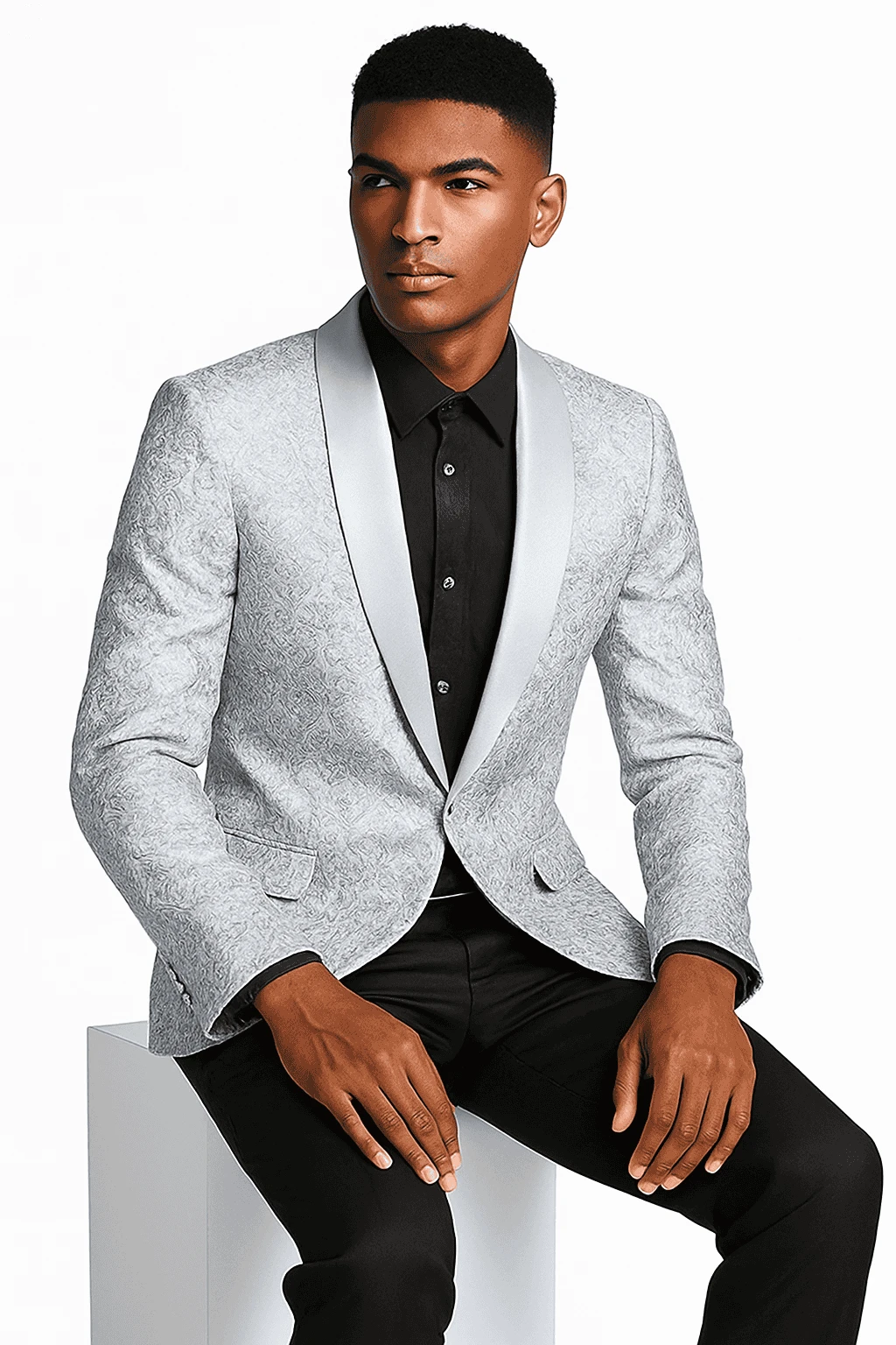 Make a bold statement with this men’s slim fit tuxedo jacket in elegant silver grey. Featuring a luxurious tonal paisley pattern, satin shawl lapel, and side vents for comfort and style, this formal blazer is perfect for weddings, proms, and upscale events.