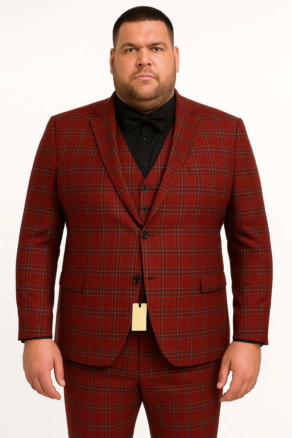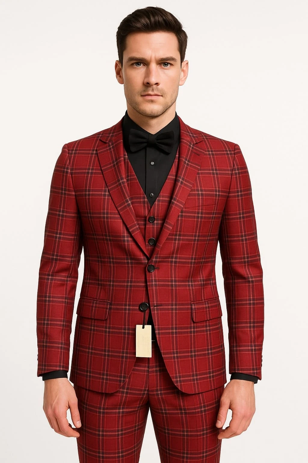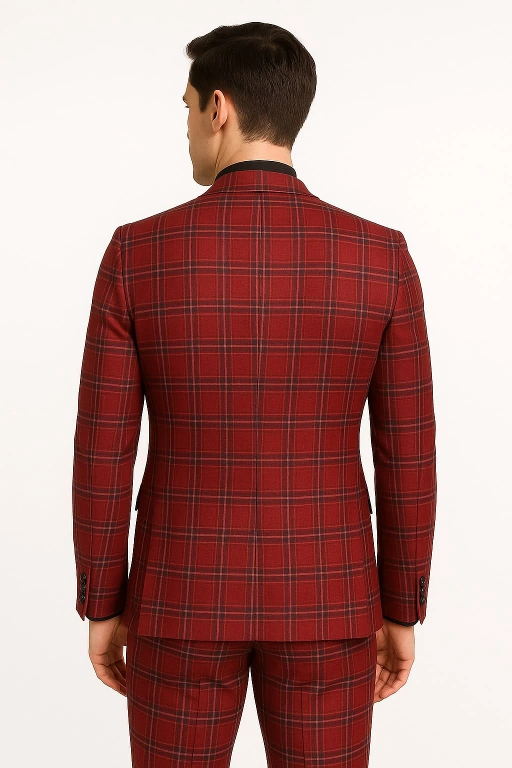Elevate your formal wear with this bold and stylish Men’s Burgundy Plaid Three-Piece Suit. Featuring a refined checkered pattern in rich burgundy with black and white accents, this slim-fit suit is designed to make a confident impression.