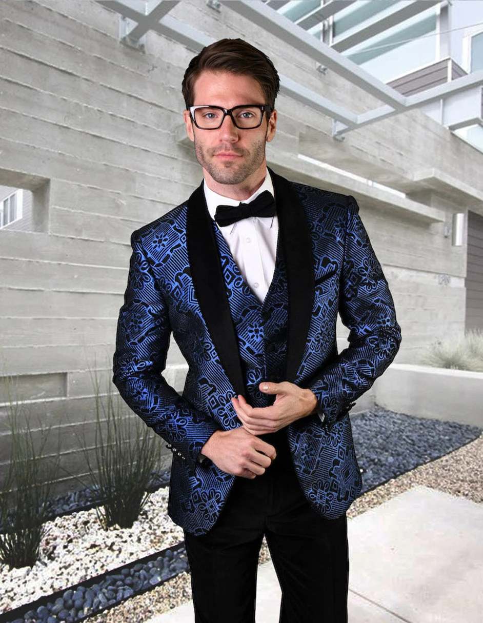 Mens Vested One Button Geometric Print Tuxedo in Royal Blue