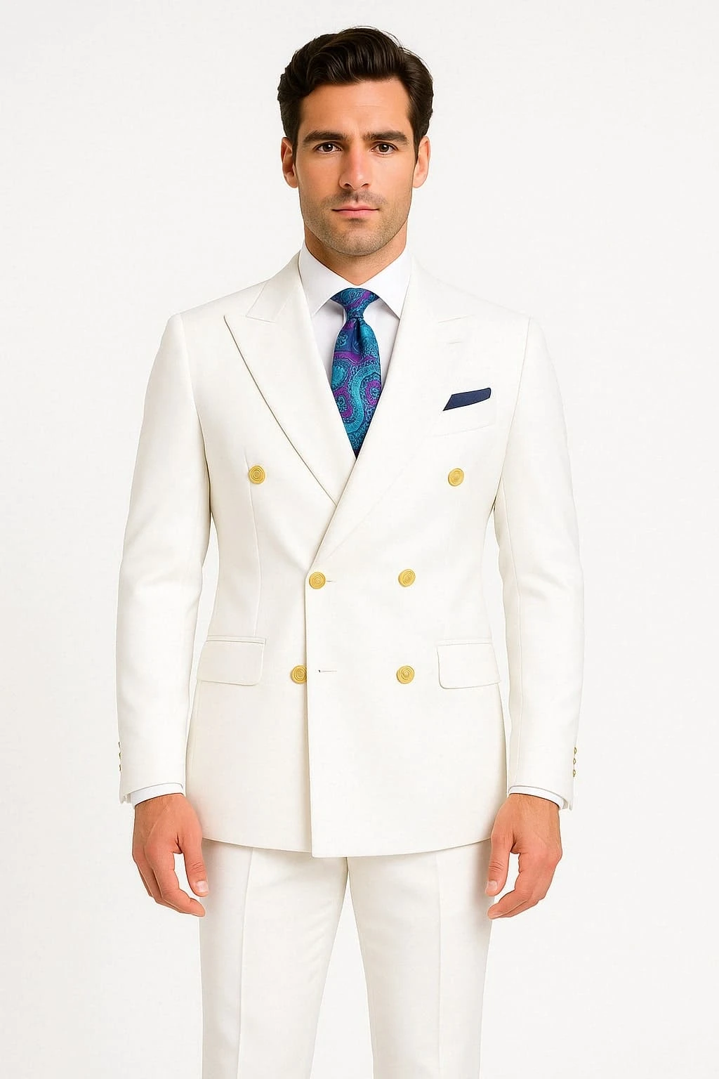 The jacket showcases peak lapels, a double-breasted six-summary front, and luxurious gold-tone summarys, adding a regal touch to the classic white ensemble. Designed with flap pockets and a slim silhouette, the suit offers a flawless fit and a high-impact finish.