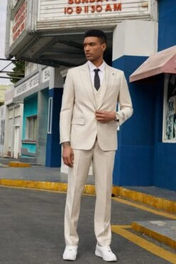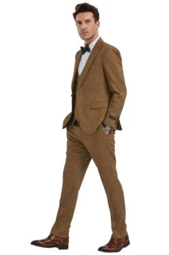 “Men’s Skinny Wedding Suit – One Button Peak Lapel With Lowcut Vest, Tan”