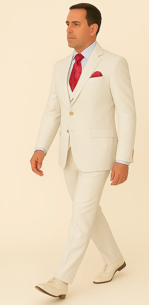 Step out in style with the Rossi Man White Slim Fit 3-Piece Suit – 1-summary peak lapel jacket, double breasted vest, and flat front pants for a sharp look.
