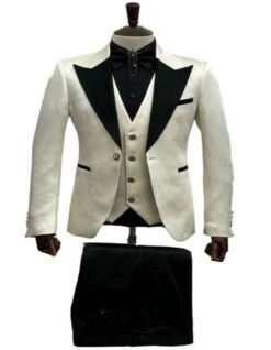 The tuxedo is enhanced with a contrasting black satin shawl lapel, adding a classic, polished touch. Complete with a matching sky blue vest and bow tie, this suit delivers a cohesive and elegant look. Whether you’re the groom, groomsman, or a guest looking to make an impression, this ensemble ensures you’re dressed to impress.