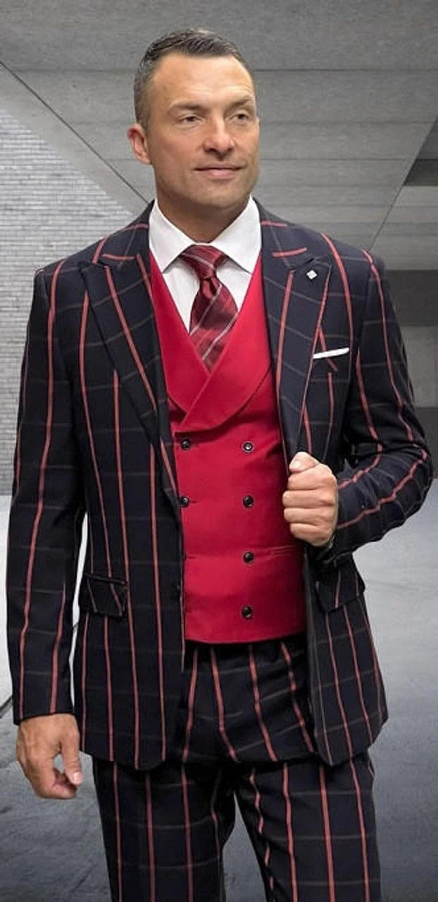 Be the first to review “Statement Men’s Wool Windowpane Suit Black Red Contrasting DB Vest Tailored Fit Lucci” Cancel reply