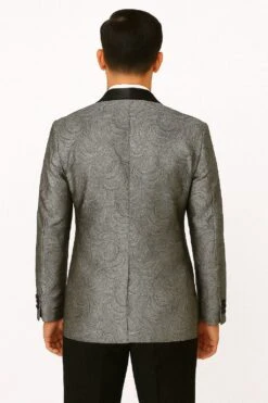 Silver And Black Tuxedo Blazer With Matching Bow Tie – Paisley Sport Coat For Prom Or Wedding
