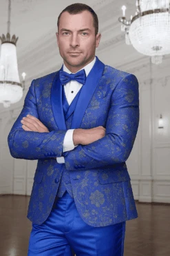 Men’s Royal Blue Paisley Lace Print Tuxedo With Double Breasted Vest – Prom & Wedding Suit